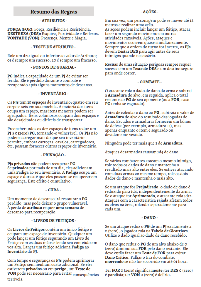 Perfeito tanto para Jogadores veteranos que desejam se desvencilhar de um conjunto sufocante de regras para administrar um estilo de jogo "decisão e não regras" e que privilegia a astúcia e criatividade dos jogadores, como para iniciantes que encontrarão regras concisas para criar os personagens em 2 minutos, classes como "você é o que você carrega" e simplicidade elegante para começar a jogar rapidamente.