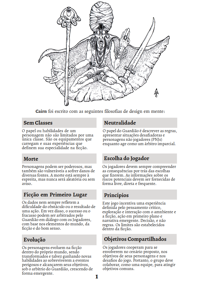 Com o objetivo de dar maior acesso ao público brasileiro - e falantes da língua portuguesa - a este incrível sistema minimalista de RPG de Aventura OSR/NSR, disponibilizo o PDF com as regras traduzidas e adaptadas para o Português Brasileiro. Meu desejo é, sobretudo, popularizar Cairn no Brasil. Além de excelente no que se propõe, é gratuito.